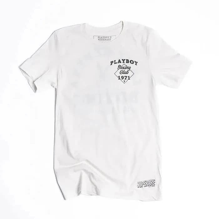 The Boxing T-Shirt White from the Playboy x Superare collection is a celebration of an iconic era where the worlds of Playboy and boxing intersected, specifically commemorating the historic George Foreman fight at the Playboy Club in Lake Geneva, Wisconsin, during the 1970s. This shirt isn’t merely clothing; it’s a stylish homage to a seminal moment in sports and Playboy history.