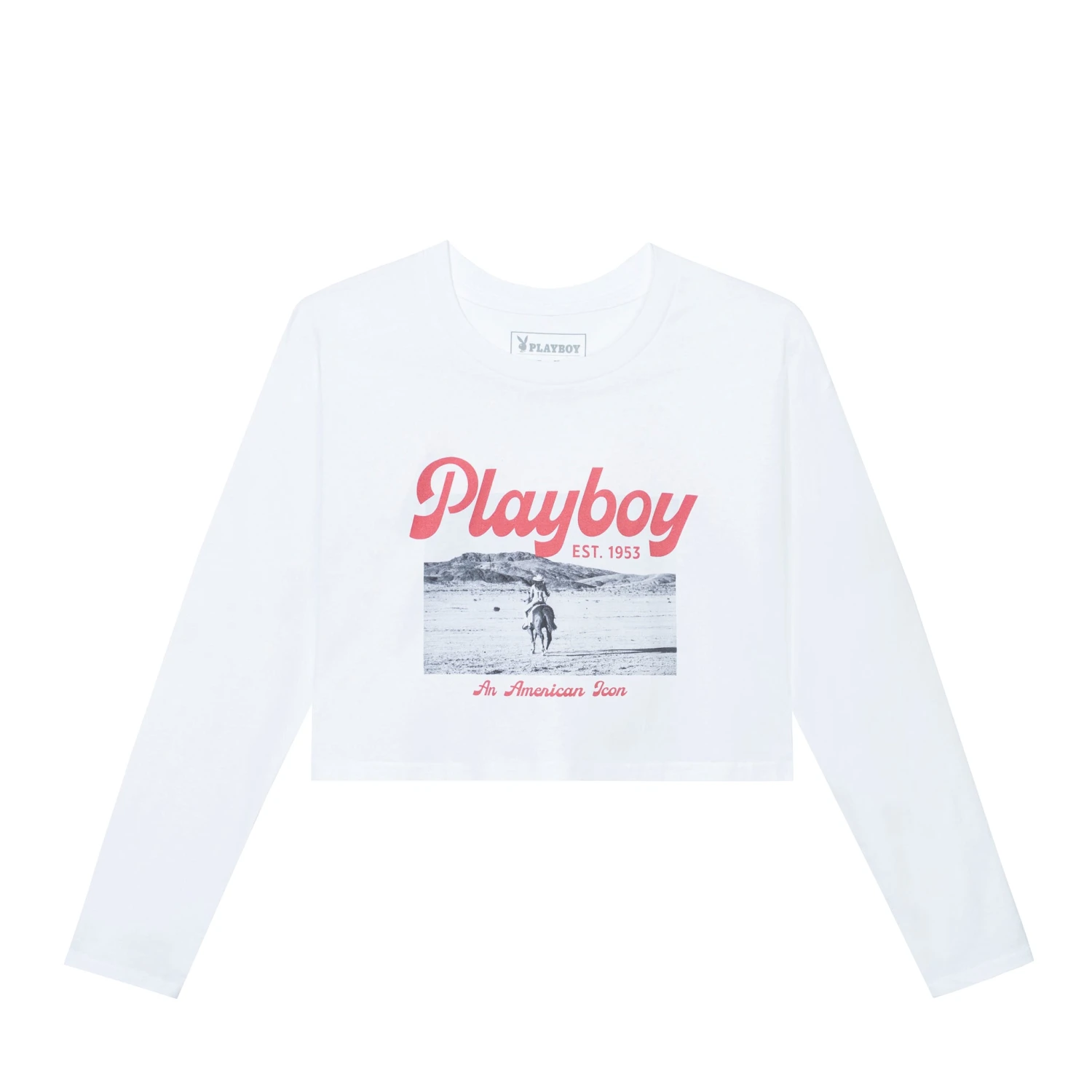 Delve into the realm of vintage allure reimagined with the Desperado American Icon Women’s Cropped Long Sleeve by Playboy. This piece isn’t just a garment; it’s a journey through time, capturing the raw beauty of the Joshua Tree desert and the captivating presence of Olivia Brower.