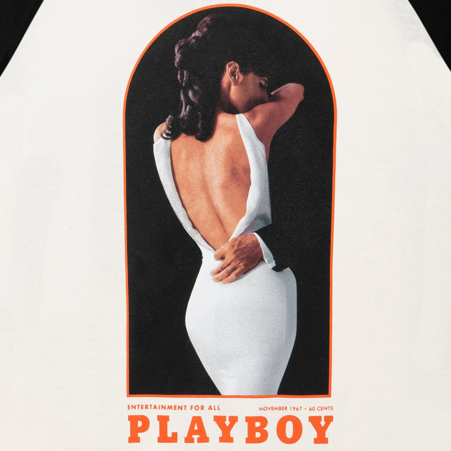 Step into a time capsule of style with the Playboy November 1967 Raglan Baseball T-shirt. The shirt features the illustrious November 1967 cover where the enchanting Beth Hyatt struck a pose for the legendary Playboy photographer Pompeo Posar. A stalwart in the Playboy family, Posar was behind 65 Playmate pictorials and 40 iconic covers. He even teamed up with surrealist Salvador Dalà for a 1974 pictorial. And here’s the kicker: Beth’s dress on the cover is subtly shaped like a Bunny!