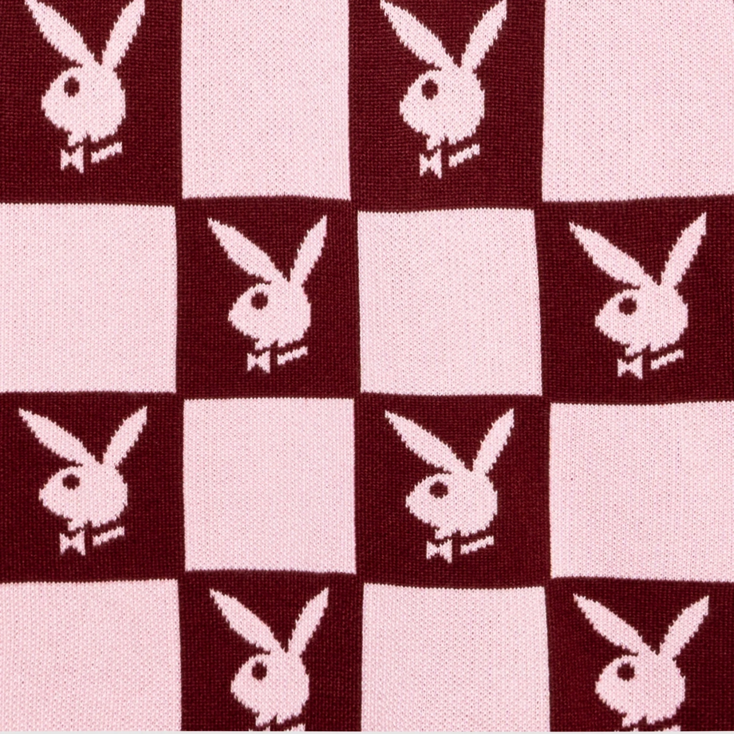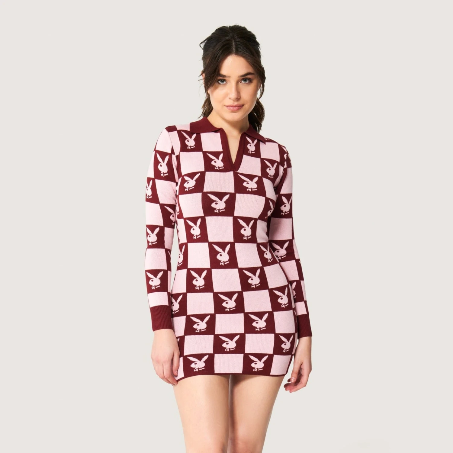 A long sleeve knitted mini dress with a V-neckline and collar in an all over checkerboard print featuring the iconic Playboy bunny.
